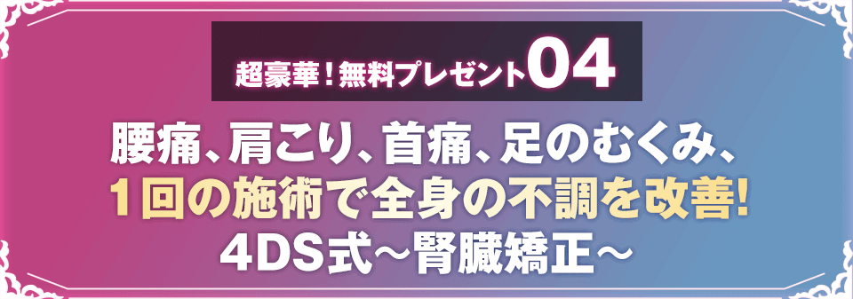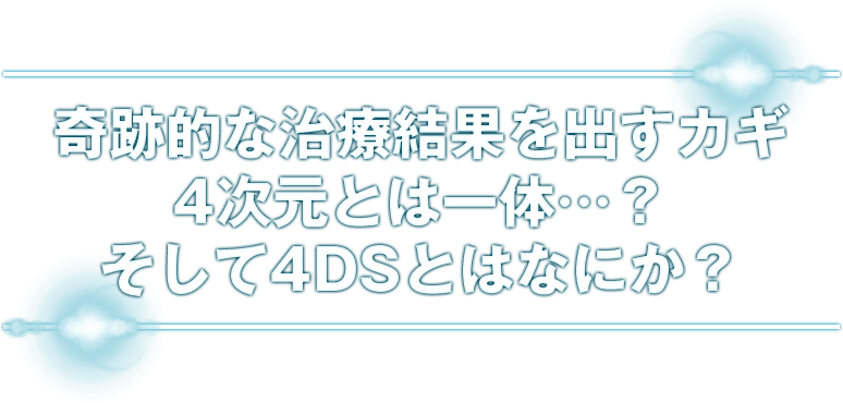 4DSとは4 Dimension Systemの略称、日本語に訳すと「4次元システム」という意味になります。なぜ、これほど高い効果が出せるのか?その秘密は、4次元で人の体を治療する「最新理論」にあります。