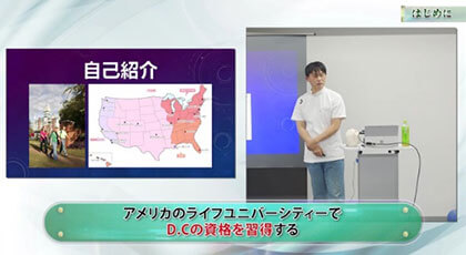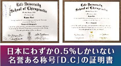 アメリカのライフユニバーシティでさまざまなテクニック(ディバーシファイド、ニーチェス、ガンステッド、SOT、アクティベーター、アッパーサービカル、アトラスオーソゴナル)を学んだ後、アメリカ政府公認のドクターオブカイロプラクティックの称号を取得。(アメリカでは医師とほぼ同等の資格として扱われる名誉ある学位。膨大なカリキュラム修了したものに与えられ、日本にもわずか0.5%しかいない。)