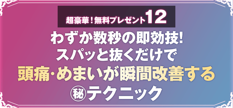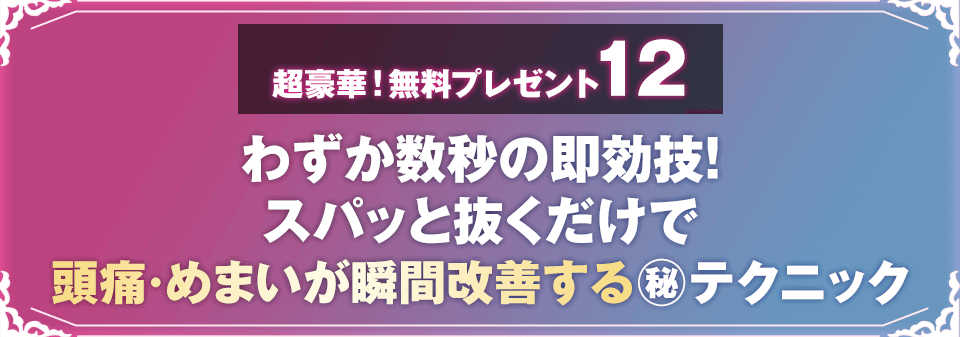 私は週に1回は頭痛に襲われます。かれこれ10年ぐらいでしょうか…。週に1回なのでそんなに気にしないようにしていましたが、激しい痛みでまともに仕事もできなくなるのが嫌だったので色々整体を受けたりしていました。ですが効果はイマイチ。しかし堀先生の手技を自分自身にやってみたら、今現在週に1回の頭痛はありません。半ばあきらめていたので、とても嬉しいです…。そういえば、頭痛起きてないな~と忘れていたぐらい痛みが引いていました(笑)