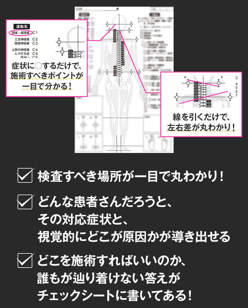 | 【特典1】 検査すべき場所がひと目で丸わかり! 患者さんの心をつかんで離さない… 「整体学」オリジナルチェックシート |