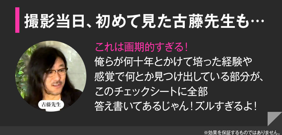 教材のみで再現できるよう、再現性にこだわって制作しておりますが、映像という性質上、お客様の練習量、理解度、相性等により習得度にどうしても差が出てしまいます。