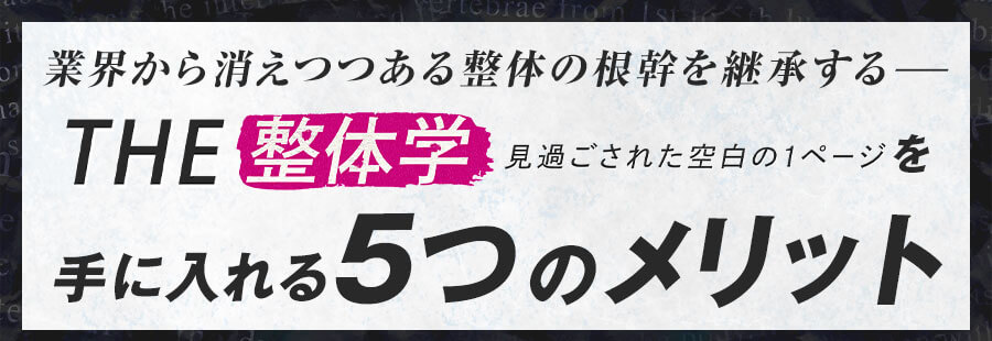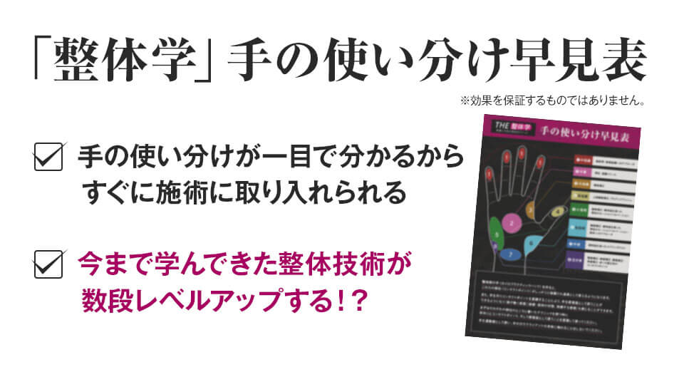 今回お伝えしている「整体学」は、整体において一番ベースになっている部分でもあります。そのため、普段お使いの手技の治療効果をさらに引き上げる効果も期待できますので、ぜひお使いください。