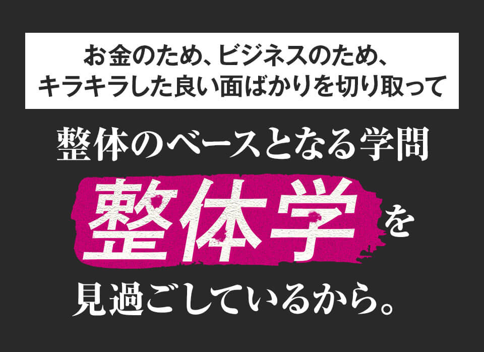 なぜなら…「お金のため、ビジネスのため、キラキラしたいい面ばかりを切り取った内容」ではなく皆が食わず嫌いしてきた「整体そのもののベースとなる学問」だから。