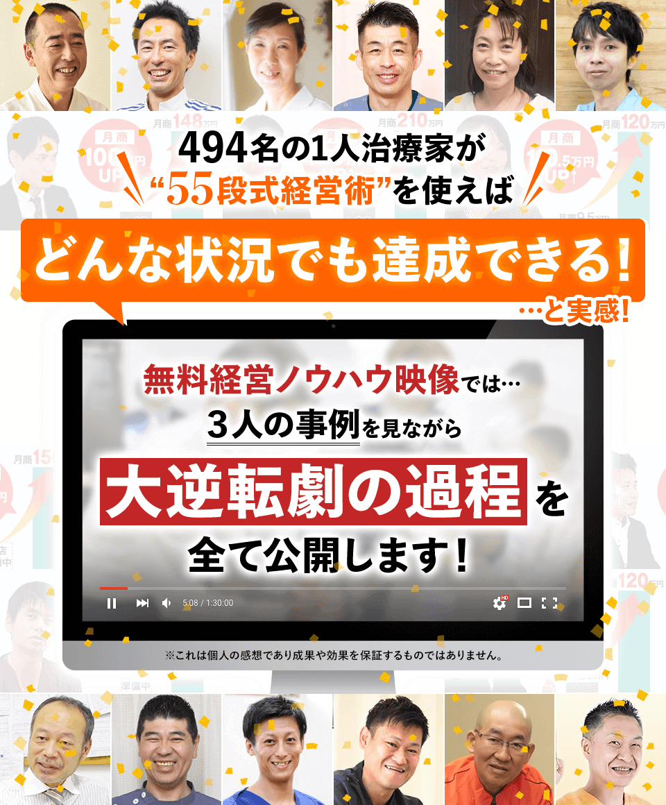 現在は、毎月の売上に悩み、廃業寸前の治療家さんたちの駆け込み寺となる、『55段階式個別指導 早野塾』の塾長として登壇し、月商9万円から月商128万円のV字回復をはじめ、合計494名を月商100万円から300万円へと導いている。