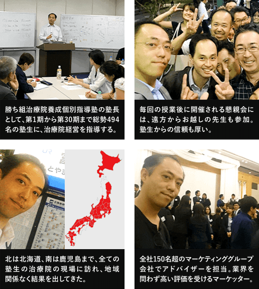 その間、治療院業界で成功している経営・集客モデルや各種ツールなどの調査・商品開発・コンテンツ制作を行い、成功モデルを体形的にまとめたものを、会員制サービス「治療院集客実践会」にて発表。