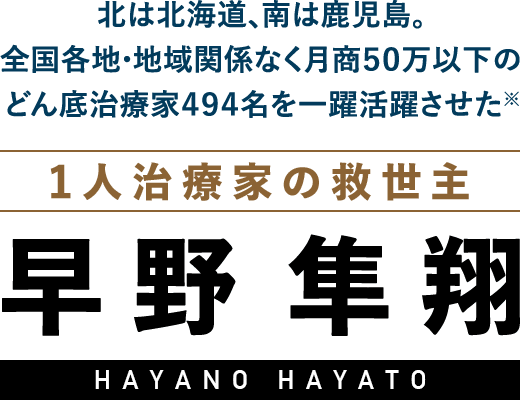 現在は、毎月の売上に悩み、廃業寸前の治療家さんたちの駆け込み寺となる、『55段階式個別指導 早野塾』の塾長として登壇し、月商9万円から月商128万円のV字回復をはじめ、合計494名を月商100万円から300万円へと導いている。