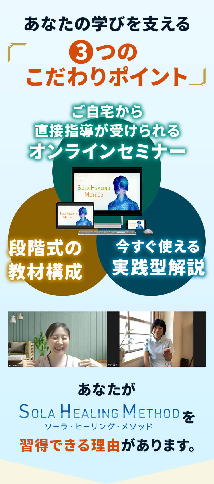 過去には自分の手技に自信が持てない時期もありました。しかしソーラ・ヒーリング・メソッドで施術をすると、相手の身体が改善している様子がはっきりと感じることができ、今では自信を持って施術が出来ています!