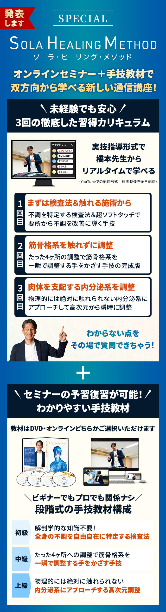 離れていても対面と同じような結果を出すことができ、即効性があってお客さんから喜ばれる手技は治療家なら必須だと思います。