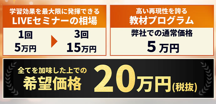 まず、教材をお求めいただき、練習を積んで実践いただいたのち、もっと技術を習得したい、再現度を高めたい、というご要望があればセミナー参加もご検討いただけますと幸いです。