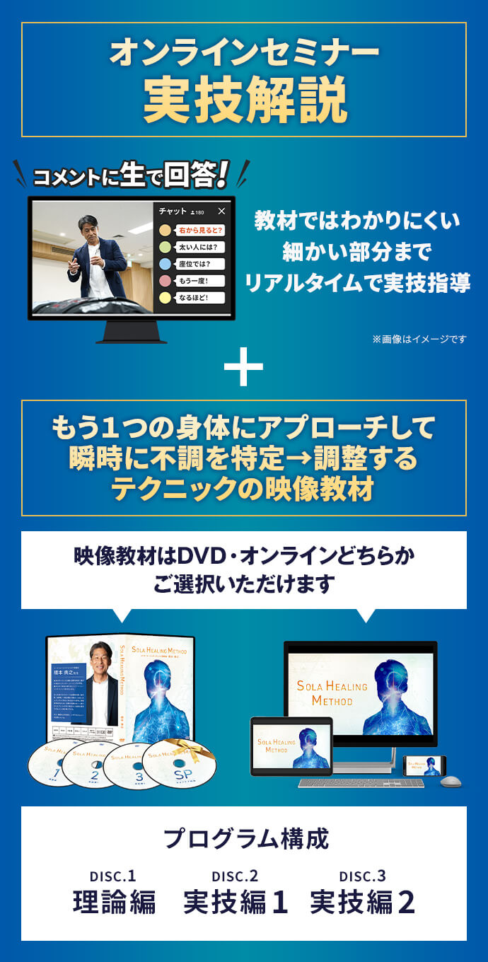 橋本先生からリアルタイムで実技指導が受けられるオンラインセミナー(3回)に加え、