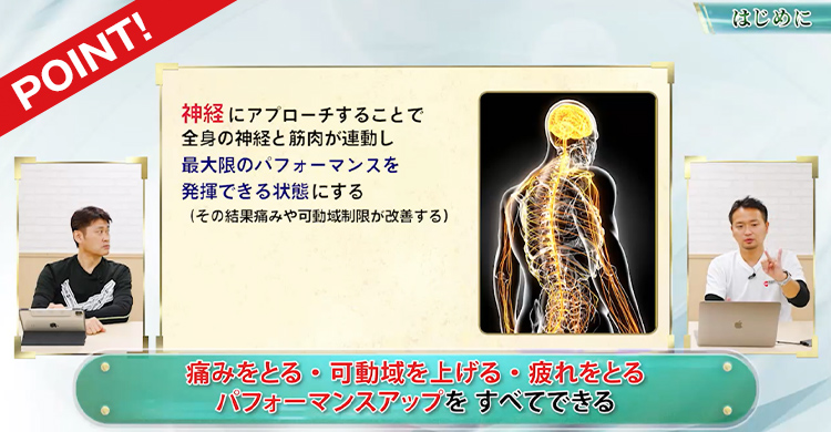 弱化していた神経を繋げ、筋肉を今まで以上に使えるようにすることで、スポーツ選手やアスリートのスポーツ疾患の改善、さらに医学の常識を越えたパフォーマンスアップまで実現してしまうのです。