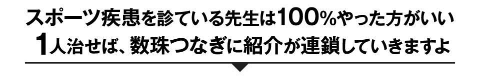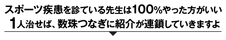 膝の半月板を損傷し、整形外科で2回も膝の手術をしたが、しゃがめない、階段も交互に降りれないなど日常生活もままならないハンドボール選手が、試合に出て終了間際に点を決めました。元々全国1位を経験したこともあるハンドボールのスター選手だったので、2回の手術でも治らなかったことがメンタル的にも辛いという状態でした。その選手が決めたのはその1点だけでしたが、隣にいた保護者がこの1点を待っていたと涙を流したのにもらい泣きしました。そんな感動体験を出来るのも医師もお手上げの酷い症状の患者が、自分を信じて治療を受けてくれたからだと思います。