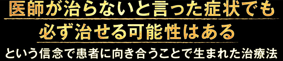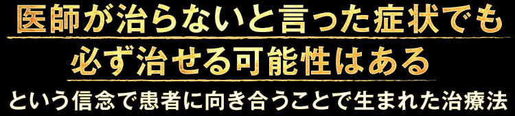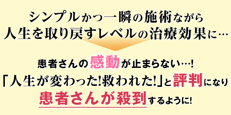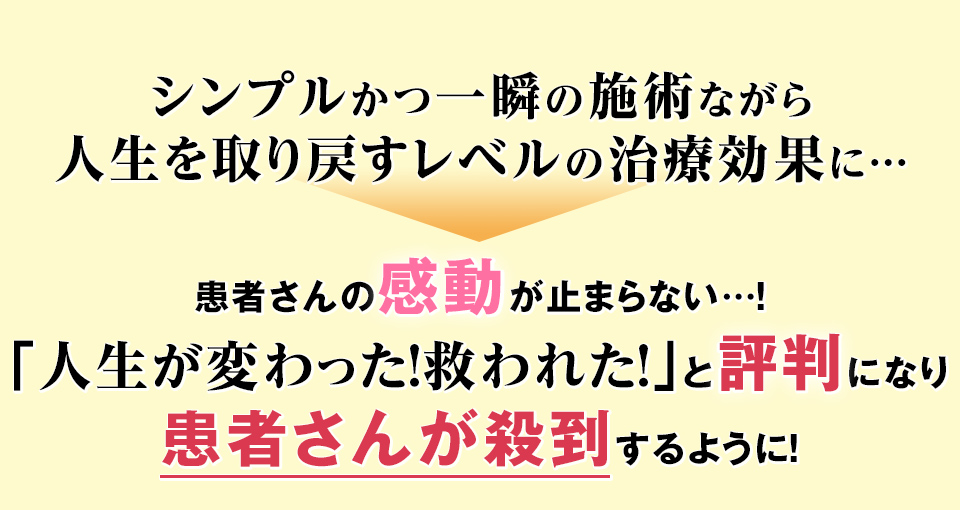 医師には「治らない」と宣告され、一生このまま良くなることはないのでは…と絶望していた症状すら、1回で改善へ導くことができるので、この治療法を受けた患者さんは百発百中と言っていいほど皆さん感動してくれます。