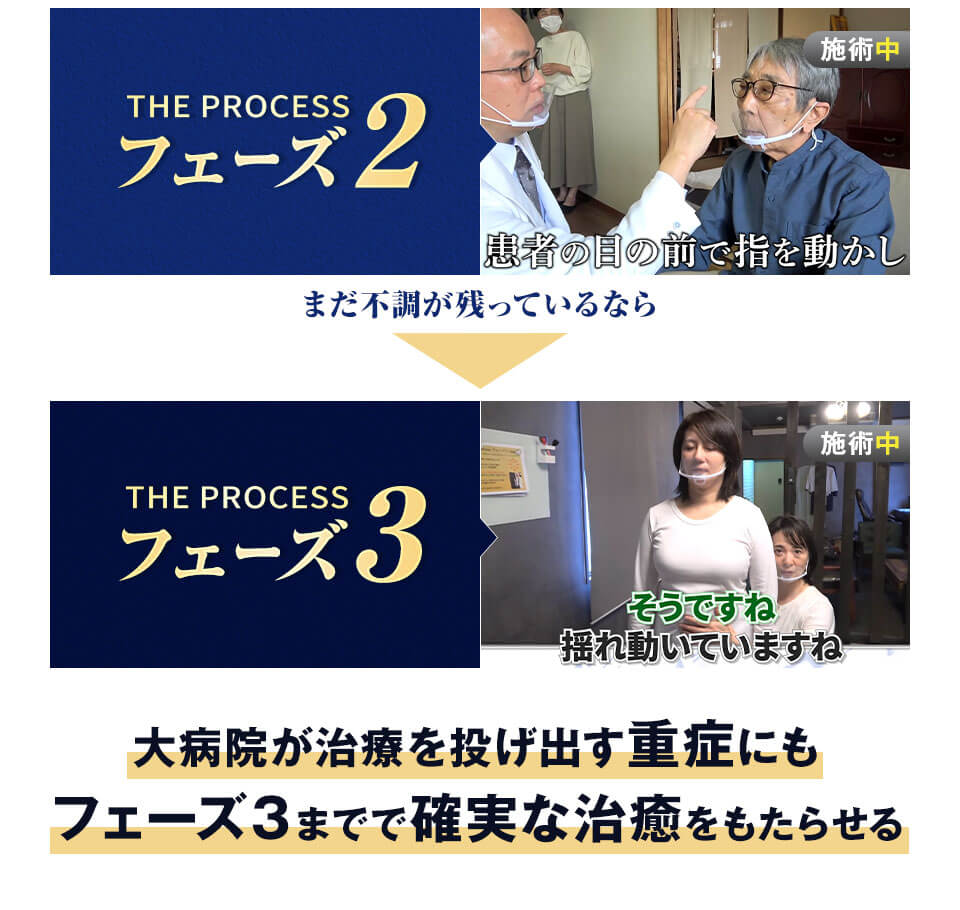 今回ご紹介している「THE PROCESS」には3段階の施術フェーズが用意されています。1の矢がダメなら、2の矢、3の矢といったように、1つ試して結果がでなくても“次になんの治療をすればいいのか”が施術すればするほど分かるように組み立てられている施術法になっています。