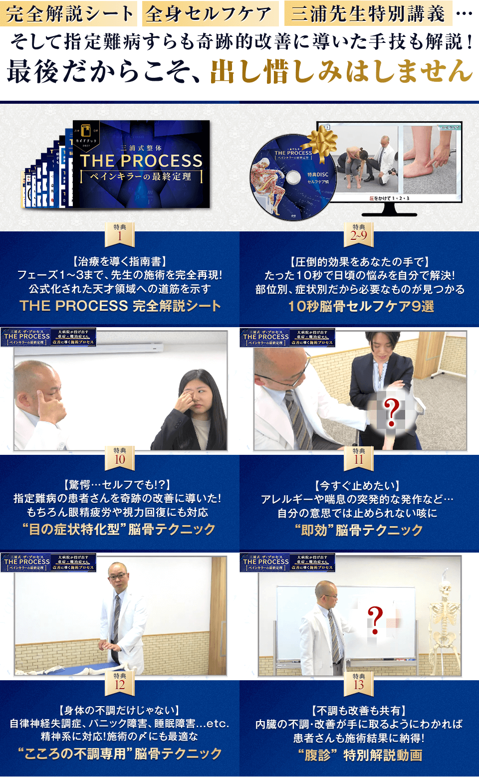 しかも、上記メリットをカイロB.C.や鍼灸師の国家資格を取得するほどの修行や勉強を一切しなくても最短1日で手に入ってしまう。そんな反則的なプログラムが『三浦式整体 THE PROCESS ~ペインキラー™の最終定理~』なのです。