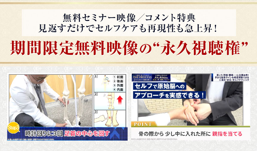 | 【追加特典】期間限定の映像が見放題に!無料手技セミナー/コメント映像の永久視聴権 | 無料で プレゼント |