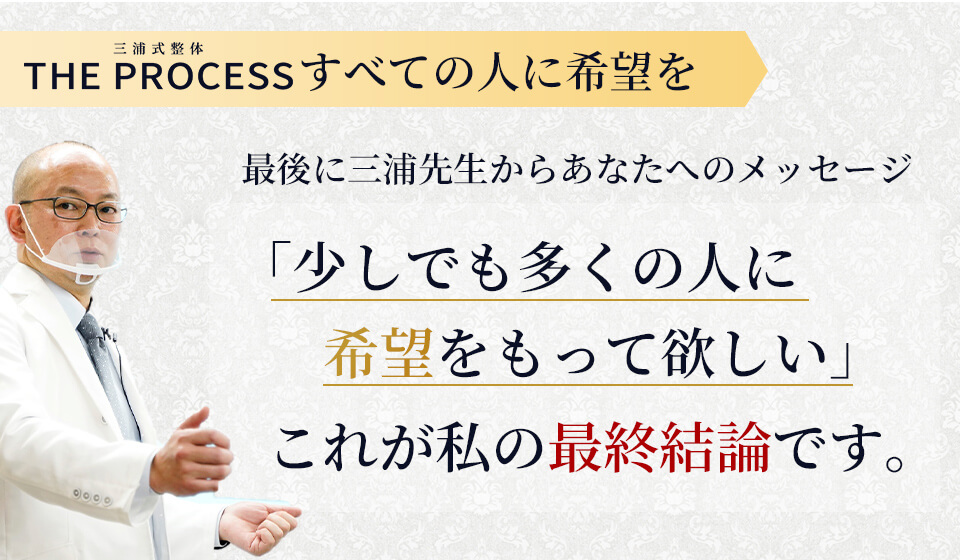 1人でも多くの方に『三浦式整体 THE PROCESS ~ペインキラー™の最終定理~』をお届けし、ゴッドハンドと呼ばれる治療家でしか快方に導けず、苦しみ続けていた患者さん・ご家族・ご友人・そしてあなた自身を不調や病気から救い出していただく為に、