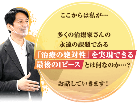 それは「患者さんの症状、施術者のコンディションで施術結果が変動するのは当たり前」であり、どんな条件下でも結果が出せる治療法はない、ということ。治療で「絶対に結果が出せる」ことは、多くの治療家さんが実現したい永遠のテーマなんです。