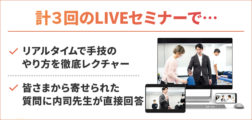 | 【あなたの手技習得を 徹底サポート!】 施術の悩み・疑問をリアルタイムで 解消するLIVEセミナーサポート |