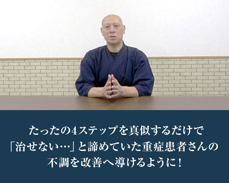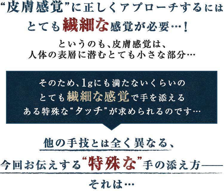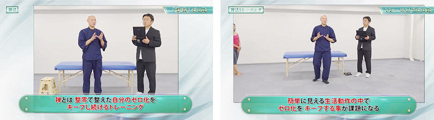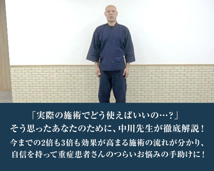 改善へ向かう治療のメカニズムを解明するために武術の知識を習得し、稽古を重ねていく中で、施術中のいわゆるプチゾーン状態が整零であること、そして皮膚感覚へのアプローチが症状を根本から改善に導くために最適であるという結論に至りました。