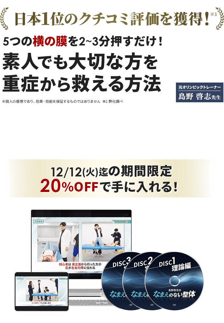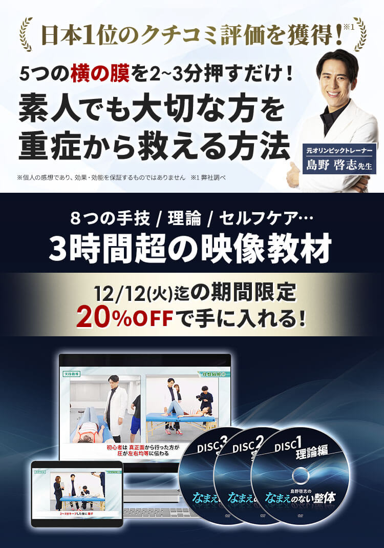 もしあなたが2つ目の未来を選びたいなら、この治療法を今このタイミングで手にいれるべきだと断言できます。【12/12(火)23:59までの期間限定】を逃すと、「島野啓志のなまえのない整体」は、同じ価格で手に入れることができなくなってしまいます。 ぜひ、このチャンスを見逃さないでください。