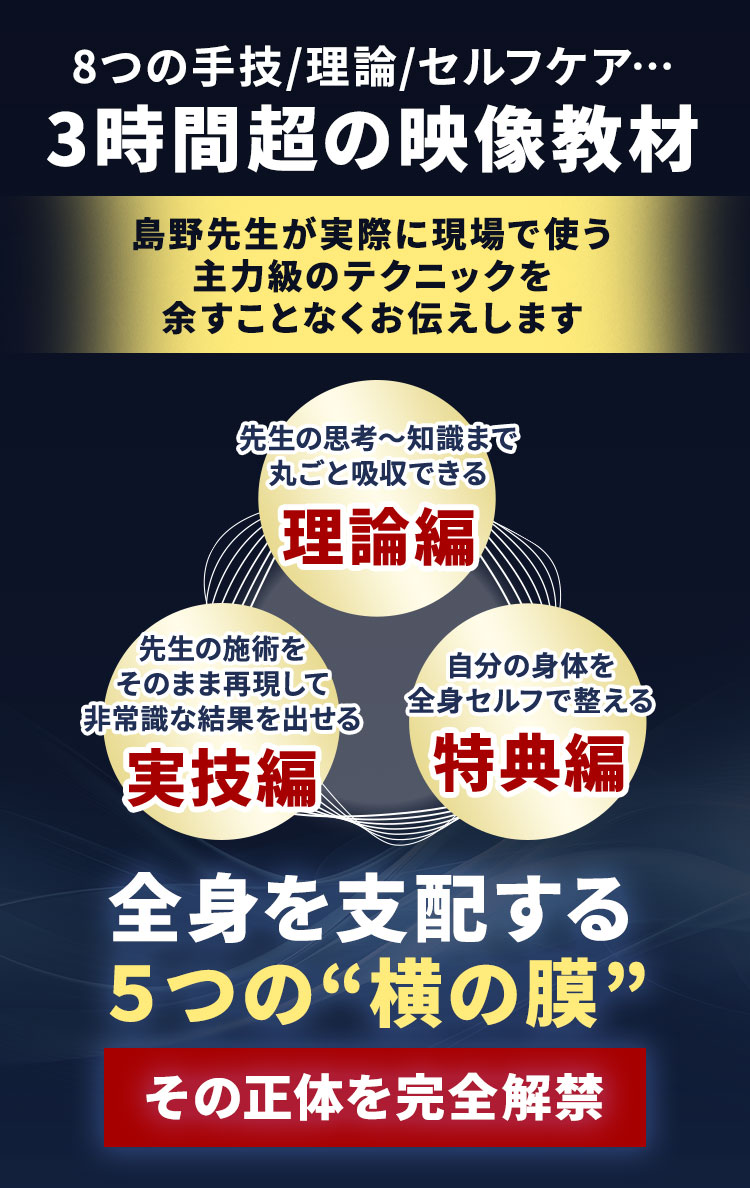 本編内容だけでは掴みきれない個人の症状や体型による施術方法まで把握できるので、これを見て学ぶだけで島野先生のレベルにグッと近づきます…