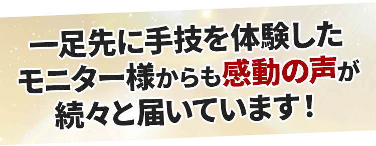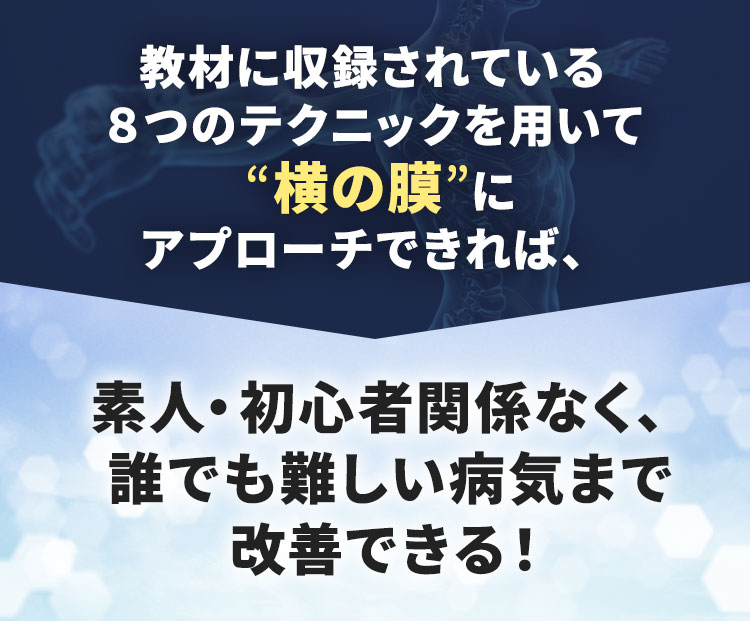 治療家さんだけではなく、主婦の方、サラリーマンなどでも効果を出されている方がいらっしゃいます。国家資格の保有者や、治療家でなくても再現できるよう、再現性にこだわって制作しておりますので、まずは、一度お試しいただけますと幸いです。
