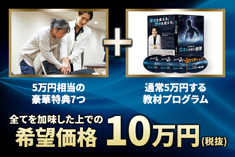 6,000万円以上の投資で導き出された島野先生の治療を簡単にセルフでできる厳選セルフケア5選、極秘指導ビデオ、施術の心得を合わせた7つ。この7つの特典だけでもDVD映像教材丸1本分作れてしまうほどのボリュームなので、本編(5万円相当)+7大特典(5万円相当)あわせると10万円の価値がある教材であり、それだけの価格でも自信を持って提供できる教材です。