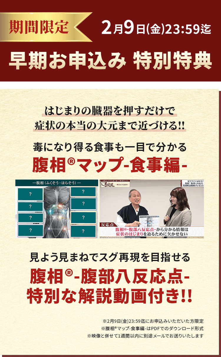 はい。今回はありません。今回は映像教材ではなく村松先生から直接指導を受けて「手技道®」を習得いただける機会をご用意いたしました。