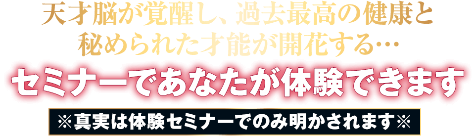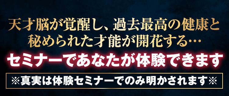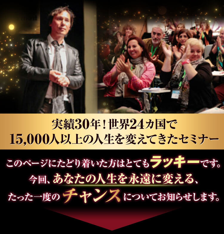 「自分の限界」を突破し、夢、健康、恋愛、人間関係…自分の思い描いたもの全てが手に入ったとしたらどうですか?このセミナーは、細胞レベルで身体が変わり、脳が変わり、見た目も変わり…自分の想像を超えた人生を掴んでいただくための、世界最高峰の人生改革プログラムです。このセミナーに参加すれば、あなたは…