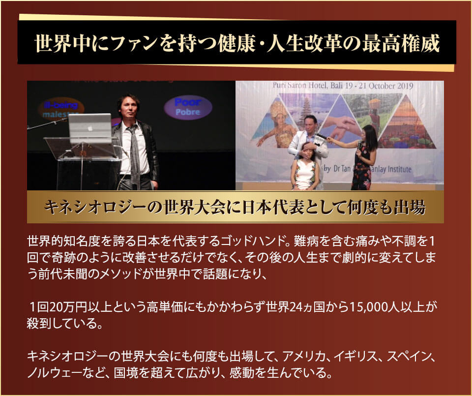 田仲先生は世界中に技術が拡散している正真正銘のゴッドハンドの先生です。日本各地、はたまた世界中を飛び回って講演活動をしており多忙を極めています。