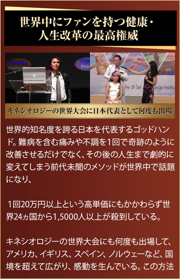 医療も含めて間違った情報に洗脳されている日本で田仲先生の技術は本当に効果の出る正しいものだと思います。間違いなく最強のメソッドですよ。このメソッドが広まることで、世界全体が変化していくと思います。