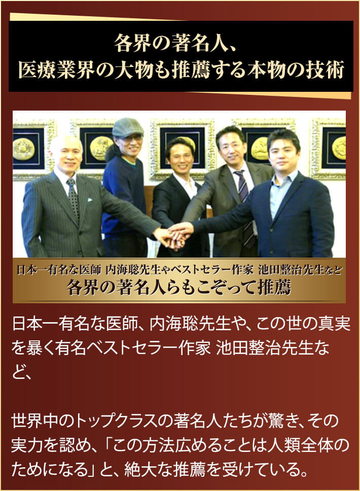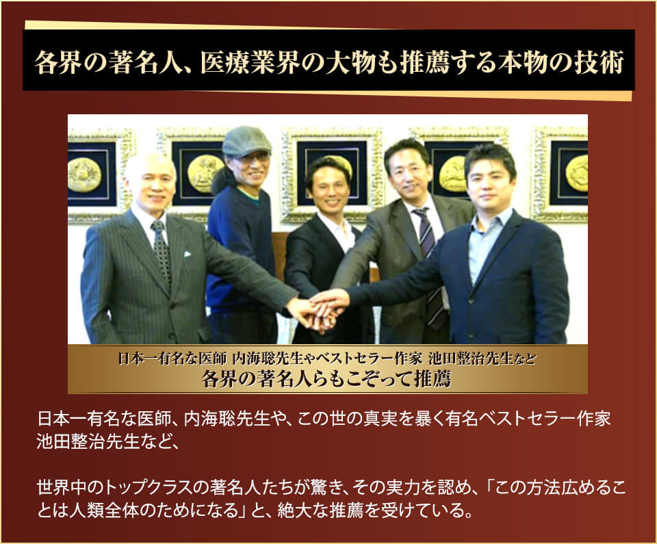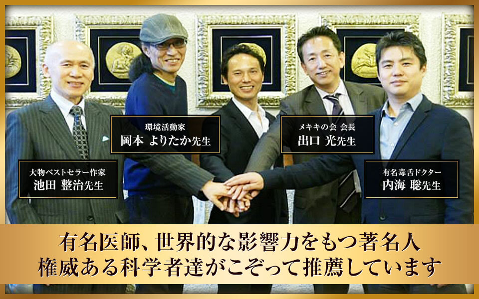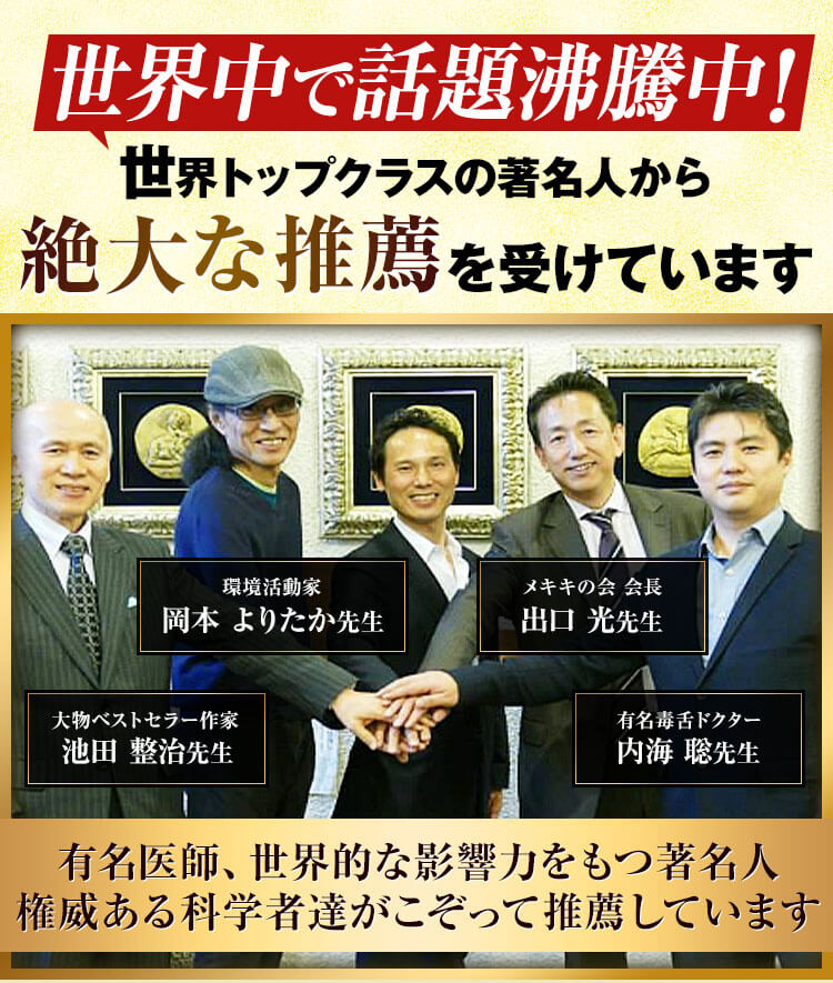 有名医師や、世界的な影響力をもつ著名人、この世の闇を暴き、本当に正しい情報を伝える活動に精力されているジャーナリストや科学者達がこぞって、「このメソッドは間違いなく本物」の太鼓判を押しているんです。トップクラスの著名人たちから寄せられた、感動のご推薦をご紹介しましょう。