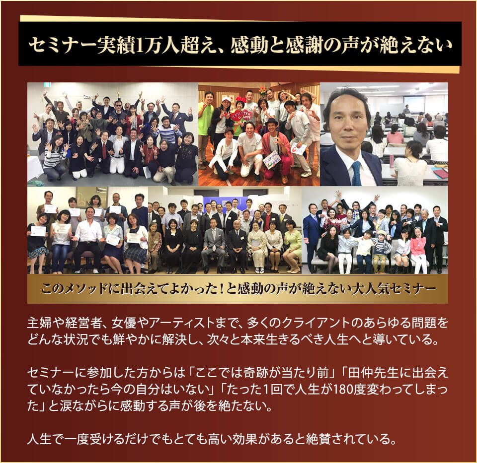 私もセミナーに参加して、人生が激変するレベルの衝撃を体験しました。田仲氏の講演や、セッションの動画を通じて、田仲氏のキネシオロジーの確かな技量と知識、さらにセミナー講師としての類稀なスキル、そしてものの考え方に大いに感銘を受けています。