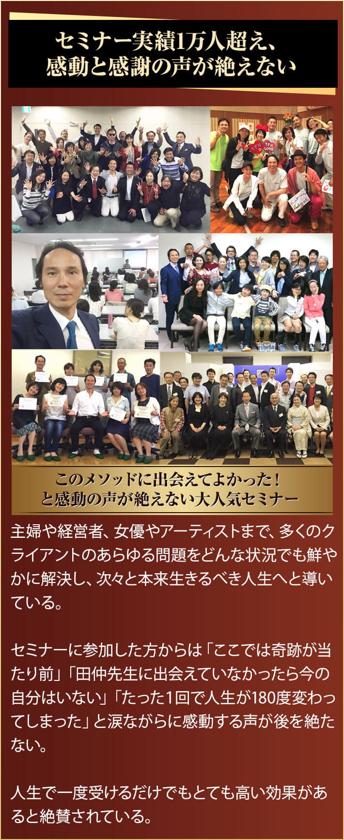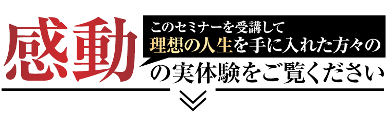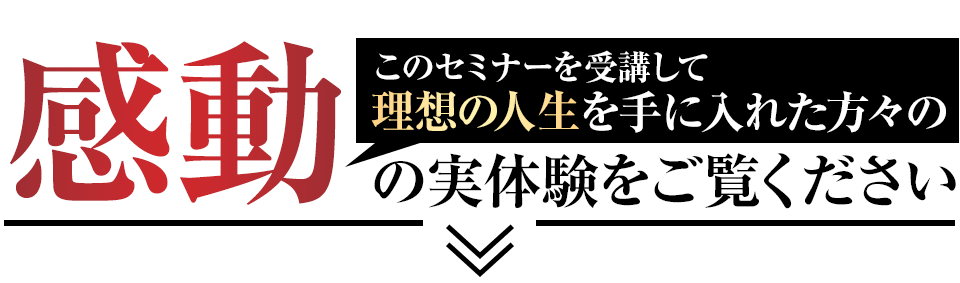 実際に、過去にこのセミナーを受講して人生を激変させた方々の感動の声をご覧ください。このセミナーに参加することで、あなたはこの方々以上の人生の変容を体感することができます。