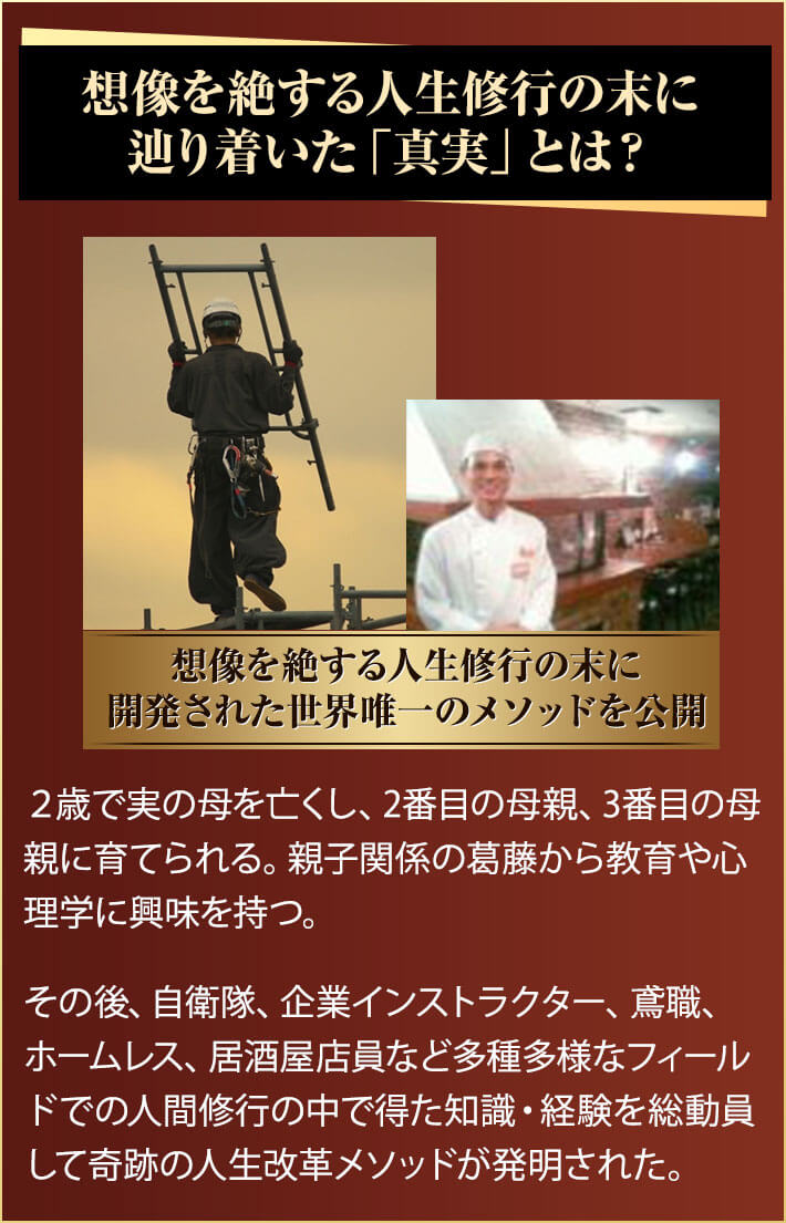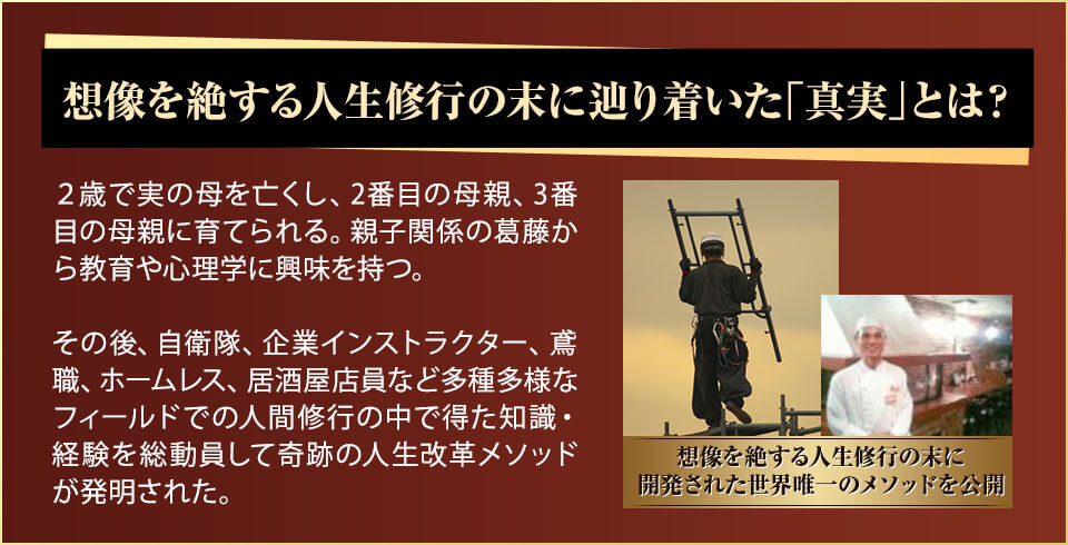 自分次第で人生の結果は変えることができるのです。それでは、あなたの人生を180度変える世界最高の知識を持つ講師をご紹介します。