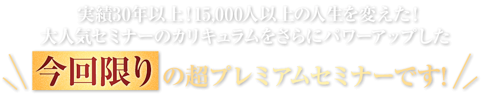 「このセミナーに出会わなければ間違いなく今の自分はいない」「一生記憶に残る感動体験ができた」「人生がまるっきり違うものに変わってしまった」と例外なく感動されているセミナーなのですが、 今回開催する内容はこれまでの内容を凌駕する究極のカリキュラムになっています。(※秘匿性の高い情報を含むのでカリキュラムの詳細は体験セミナーにご参加いただいた方だけにお伝えしています)
