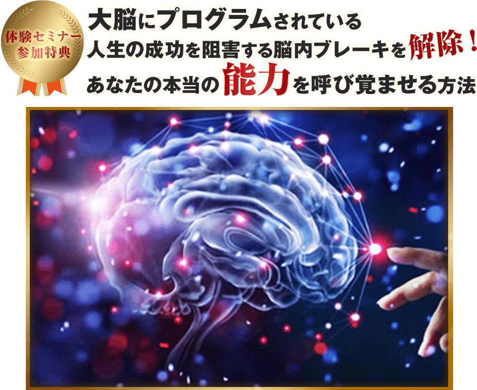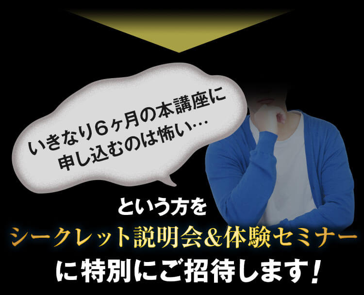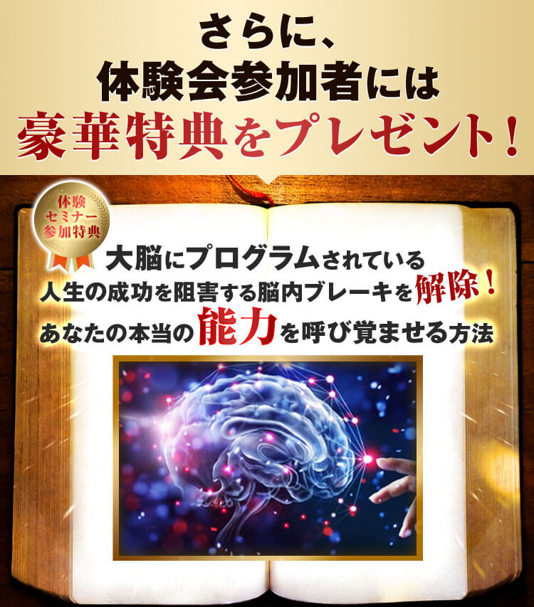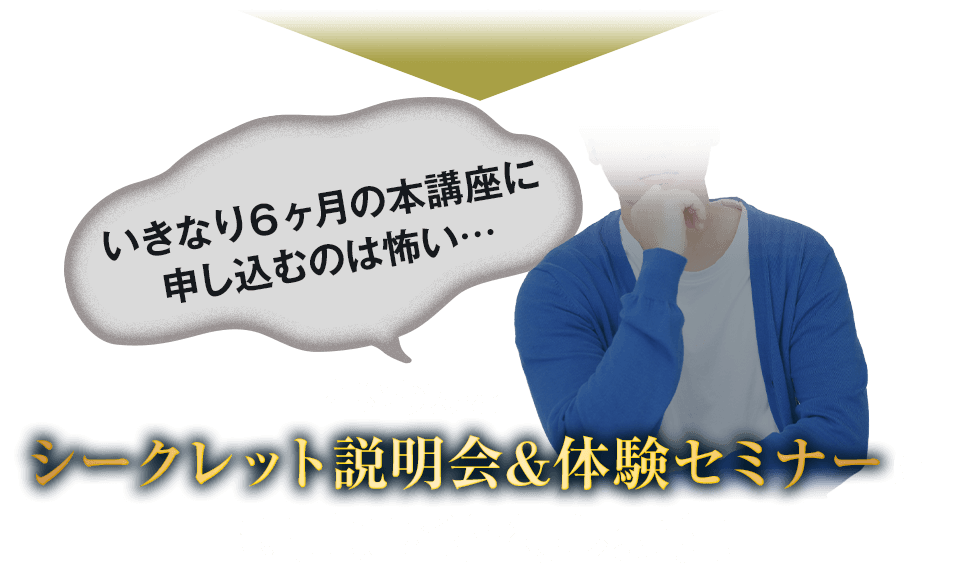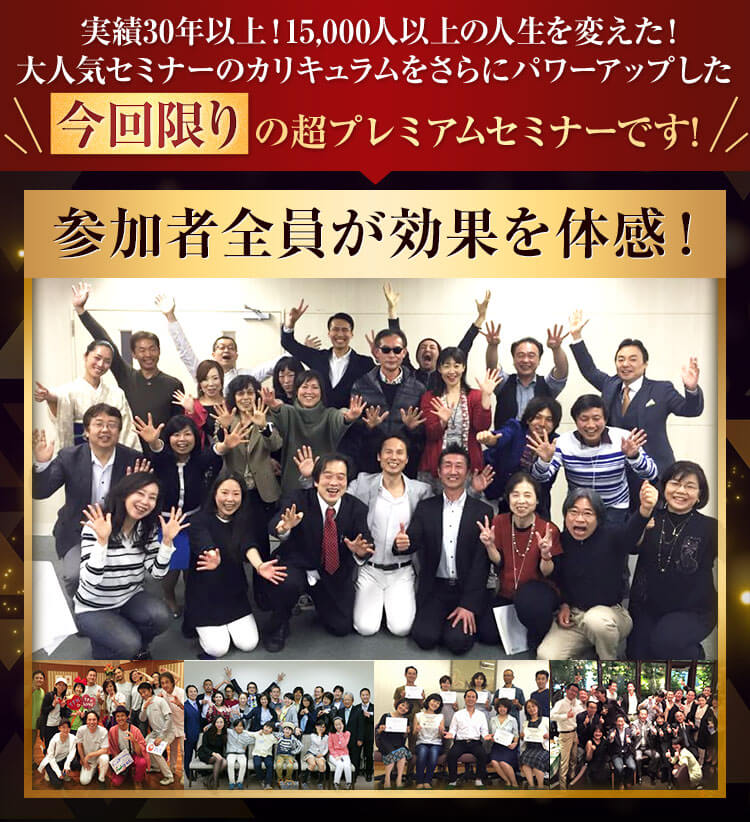 体験セミナーに参加しなければ何も得ることはできませんが、体験セミナーだけでも人生が変わってしまう方が大勢いらっしゃいますので、一度きりのこのチャンスを逃さないようまずは参加ボタンを押してください。