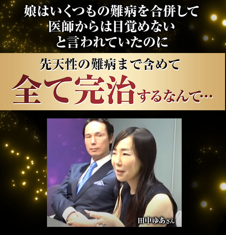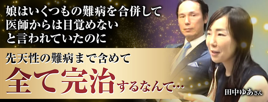 それが田仲先生に出会ったら、DNAの損傷で生まれてきたから治りませんって言われていた病気まで全部治ったんですよ!先天性の病気も含めて、ありとあらゆる病気全部です!今では普通の健常者として大学に通っています。