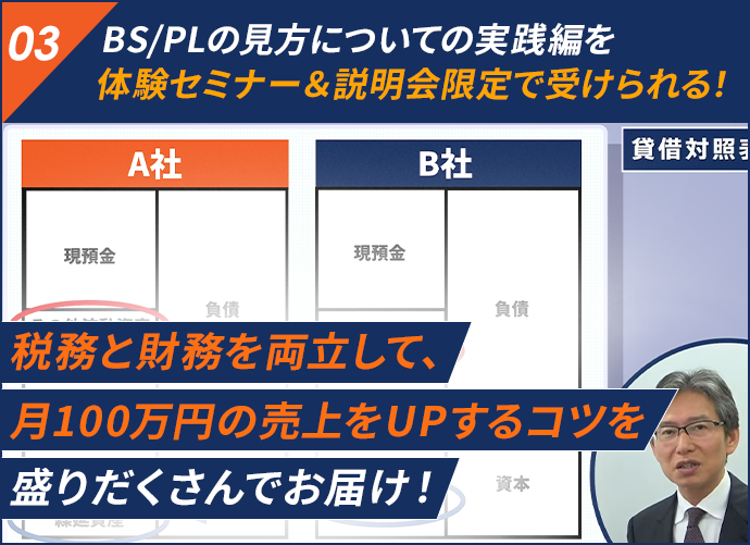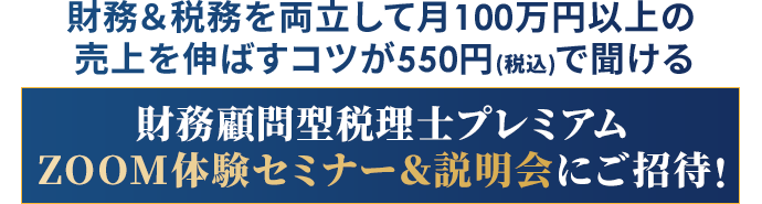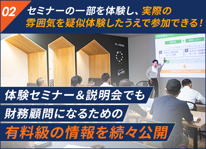 ZOOM体験セミナー&説明会の当日、セミナーの一部を体感していただき、「もっと学んでみたい!」と思われたら財務顧問型税理士プレミアム認定セミナーにお申し込みいただく形になります。