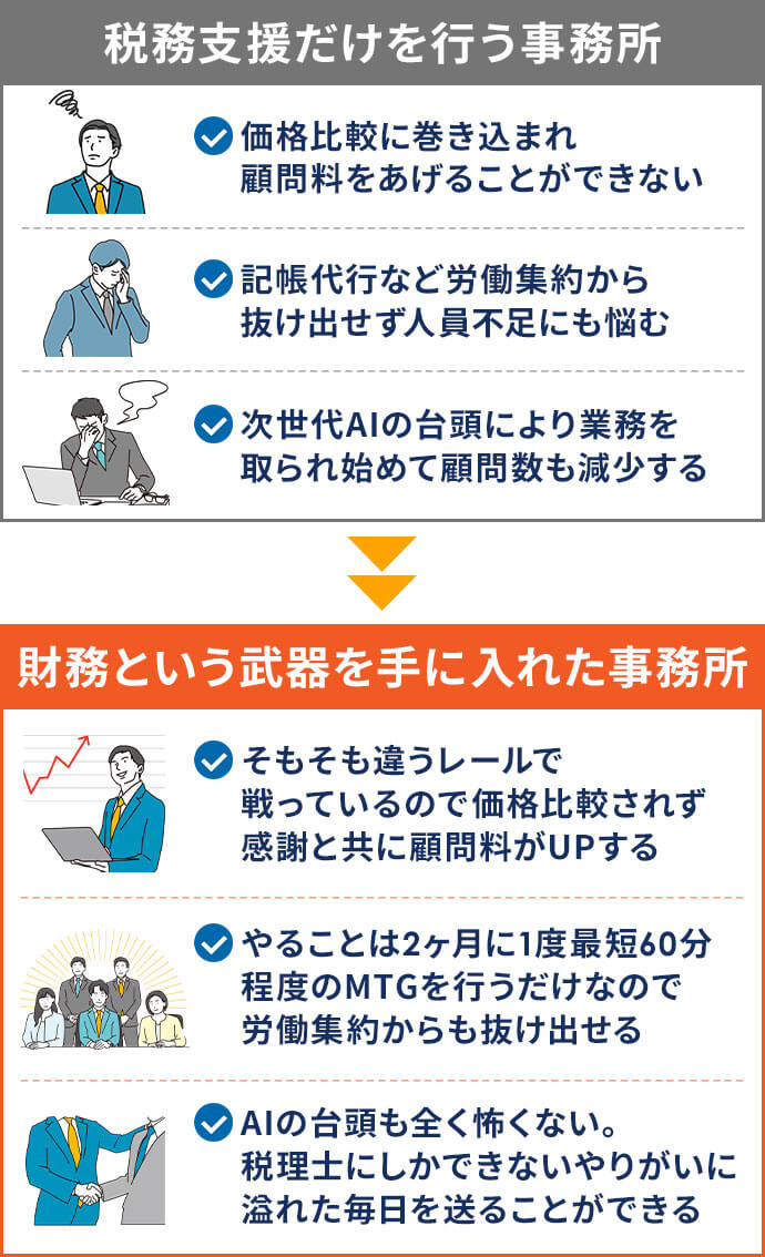 財務顧問獲得メソッドは税理士としての経験が浅い方でも再現していただけるようにマニュアル化を実現しています。逆に税務支援だけで勝負していくよりも、早めに財務という武器を手に入れておくということは今後の業界を生き抜いていくためにとても良い決断だと思います。