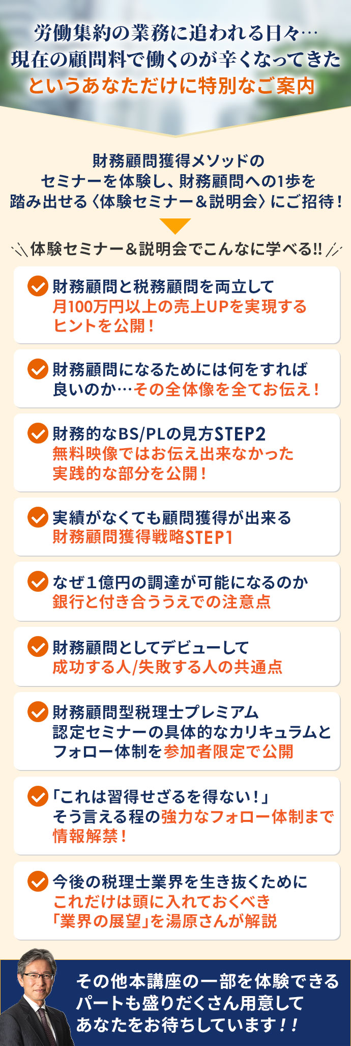 財務顧問獲得メソッドは税理士として辛い経験をした湯原さんが実体験をもとに叡智を体系化したものです。書籍に書いているようなことをそのまま講義するということはいたしません。